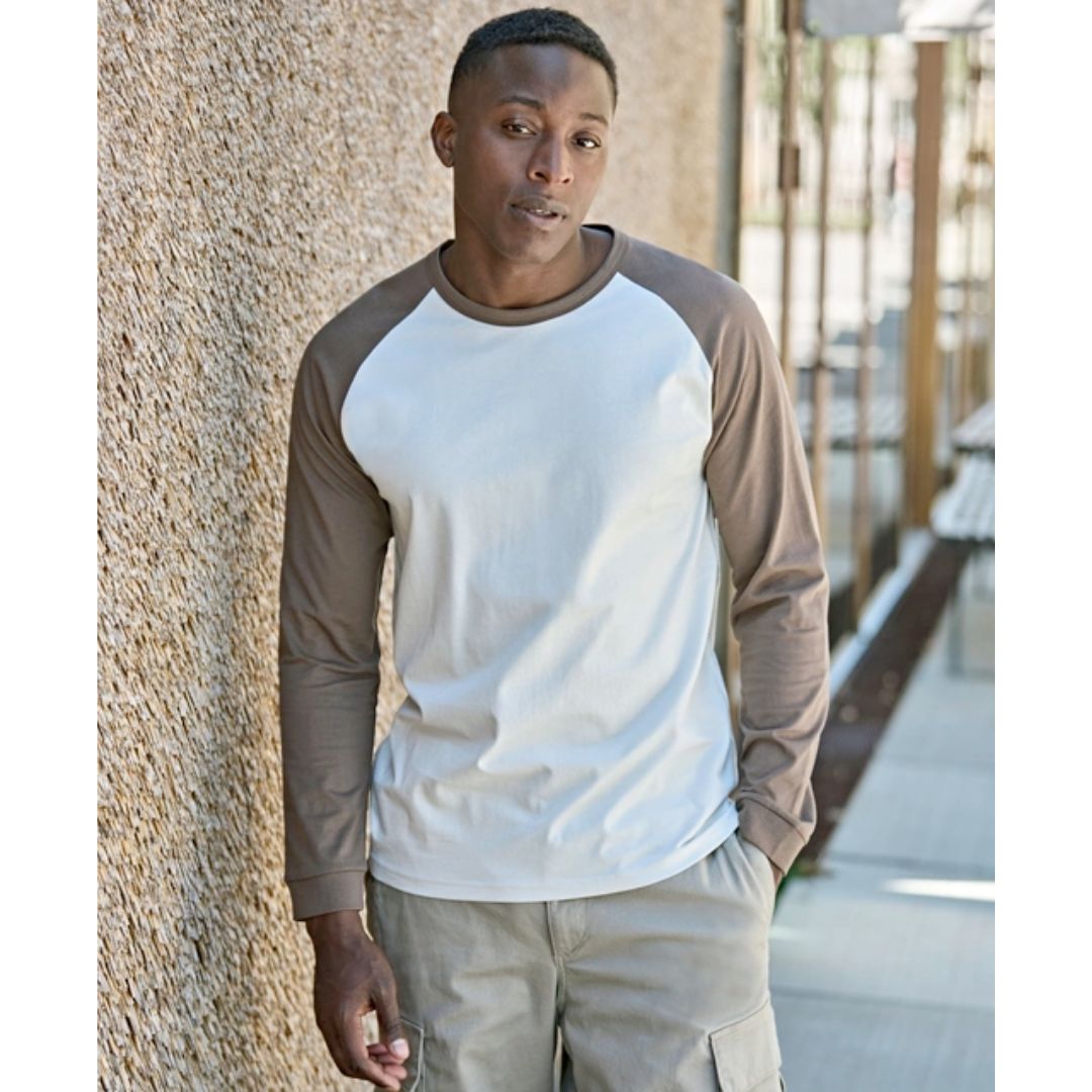 Klassisk og kraftig baseball tee der er fremstillet af økologisk bomuld. Den er gennemgået forvask og enzymskylning for en renere overflade og blødere fornemmelse. Den har buede raglanærmer og halsrib og manchetter.