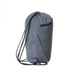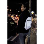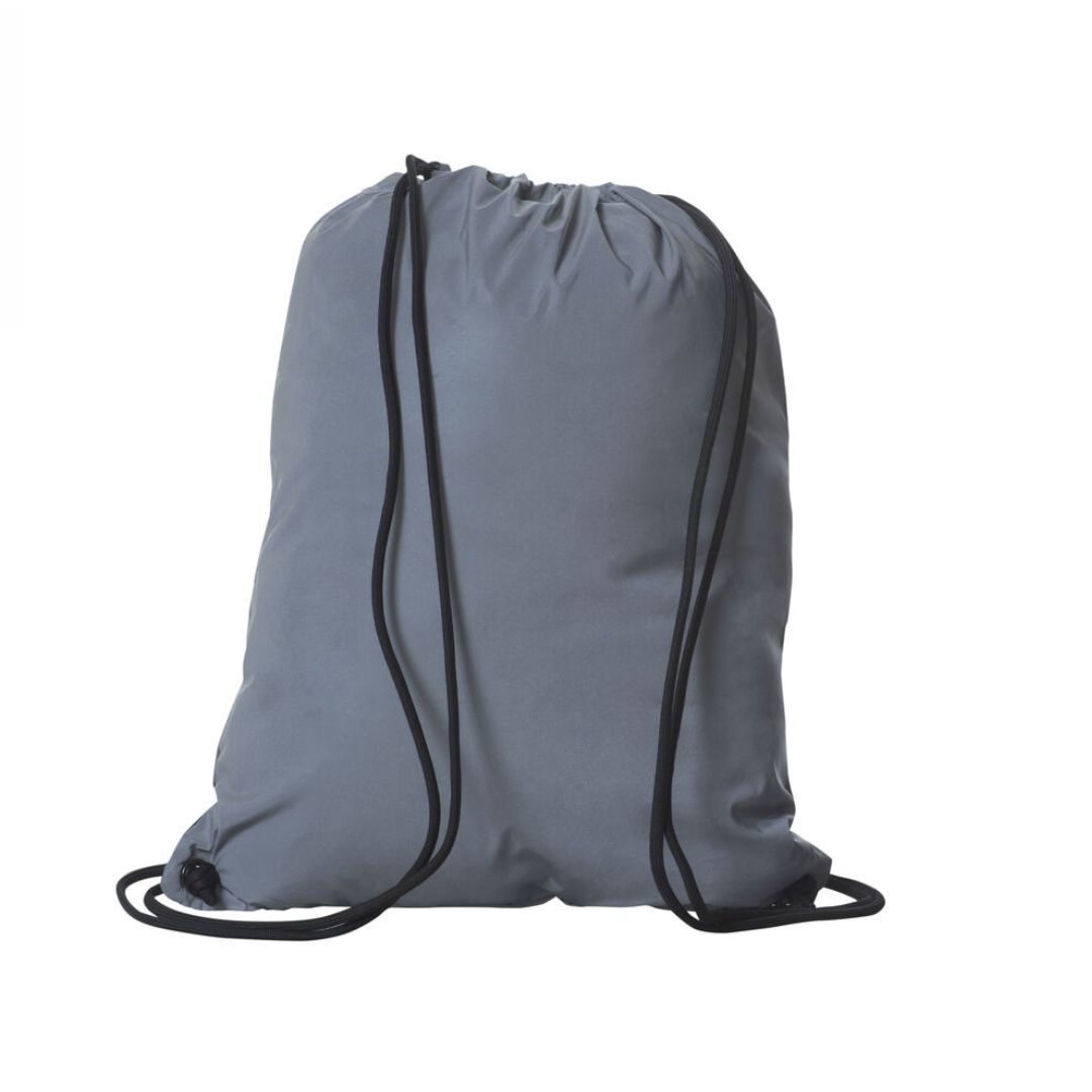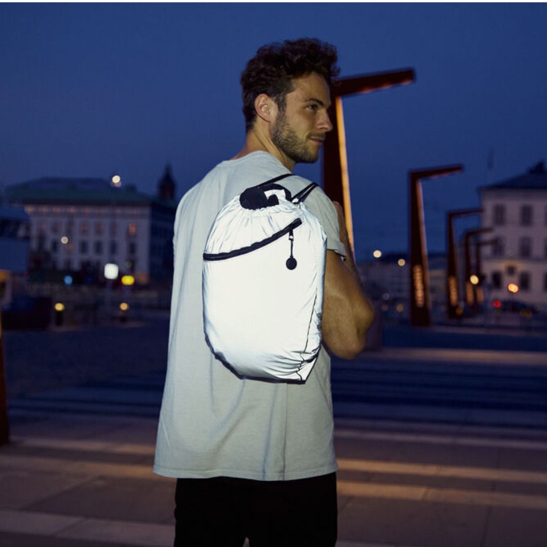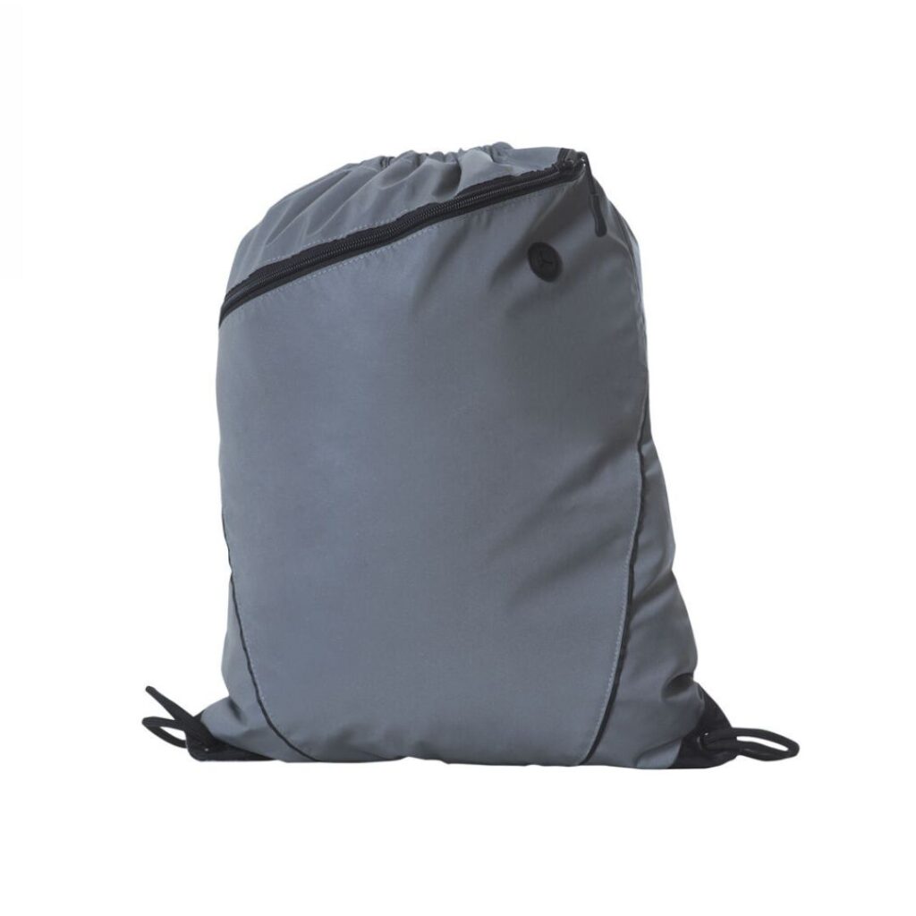 En smart taske i refleks materiale. Snøreluk, frontlomme med lynlås samt snørehul til høretelefonledning.
