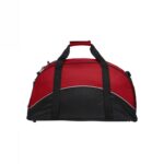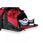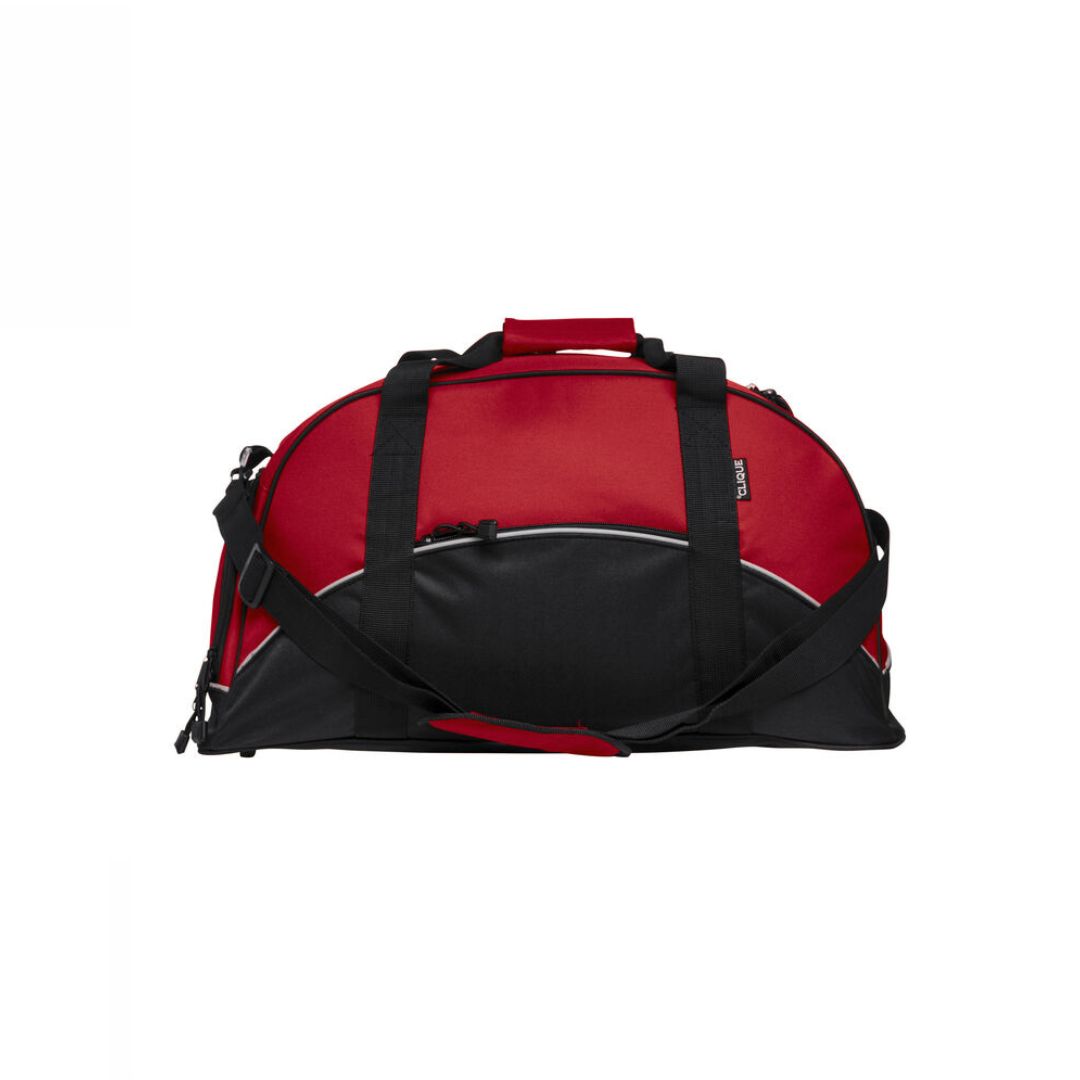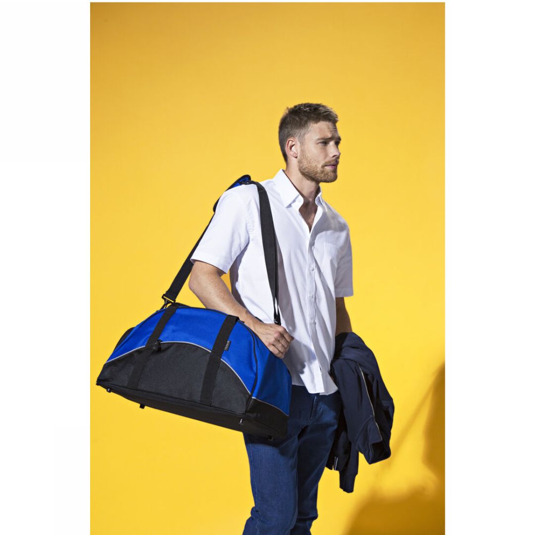 Sporty taske med åbning til sko på en af sidelommerne. Refleks piping og sort bund. Kraftige bærestropper og aftagelig skulderstrop. Lomme udenpå med lynlås.