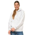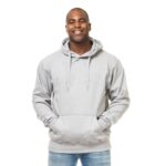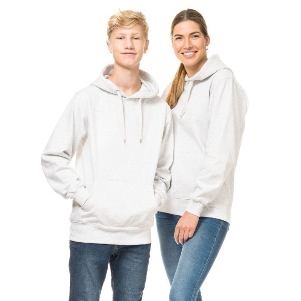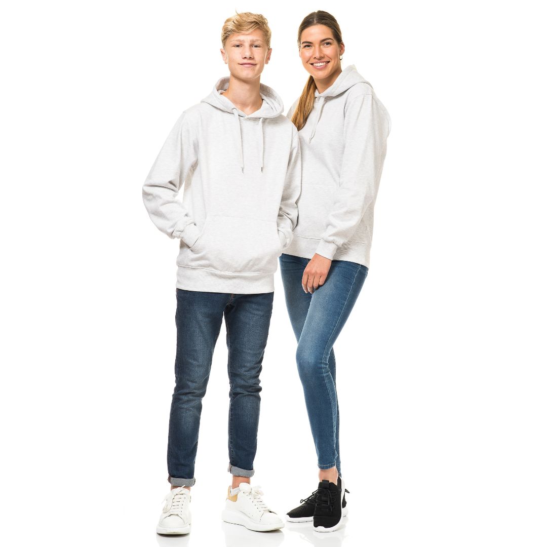 Hoodie i god kvalitet som findes i mange farver. Den har en kængurulomme foran med børstet inderside, som gør den ekstra blød. Hætte i dobbelt lag og med snørehuller i metal og snørerne er afsluttet med metalender. Ærmer og bund er afsluttet med bred 2×2 rib med elastan.