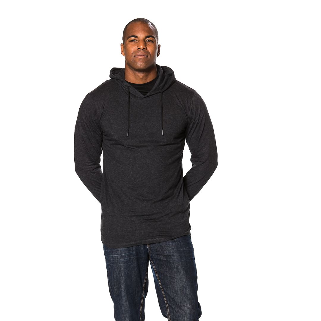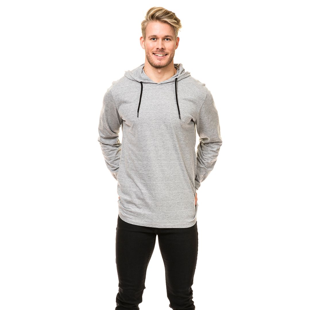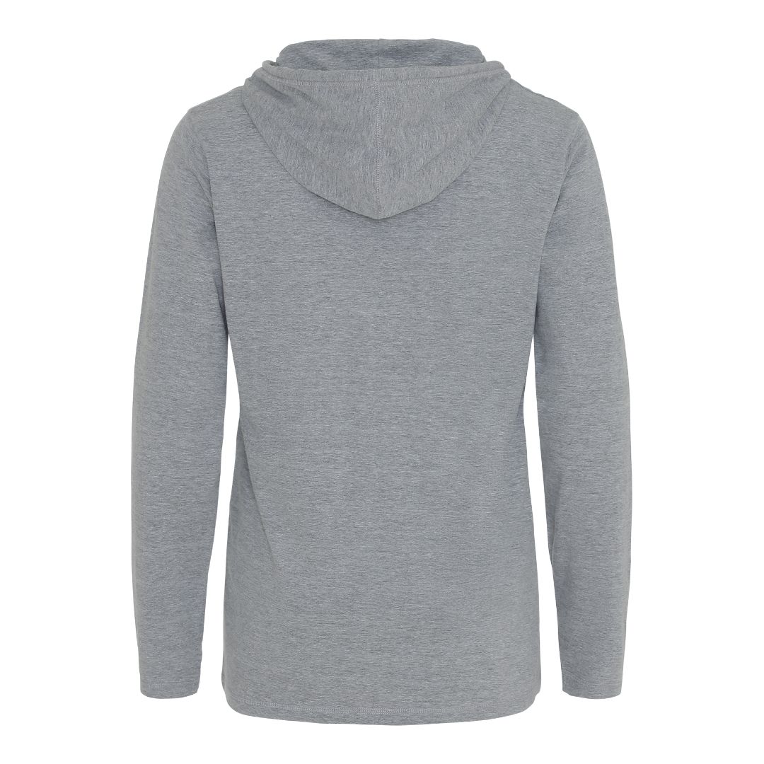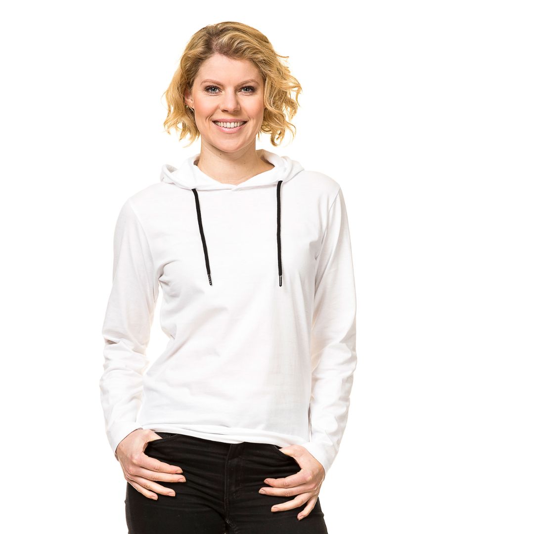 T-shirt med lange ærmer og hætte med snøre. Det giver et look som en hoody, men er en langærmet trøje.