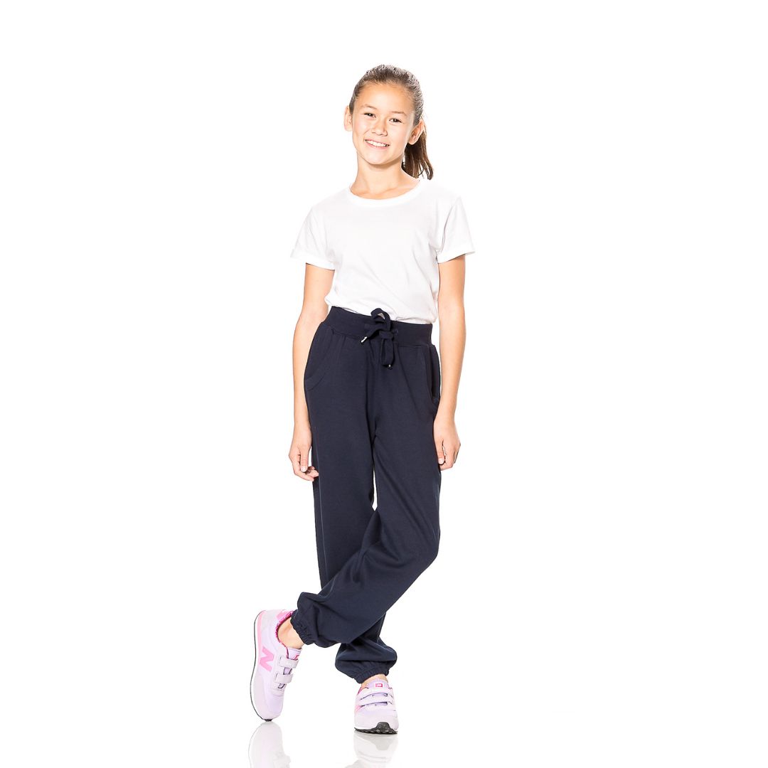 Joggingbukser i kraftig kvalitet med bred lycra rib med elastik og snor i talje, 2 sidelommer med rib, elastik forneden, let børstet inderside og sidesøm.