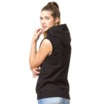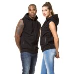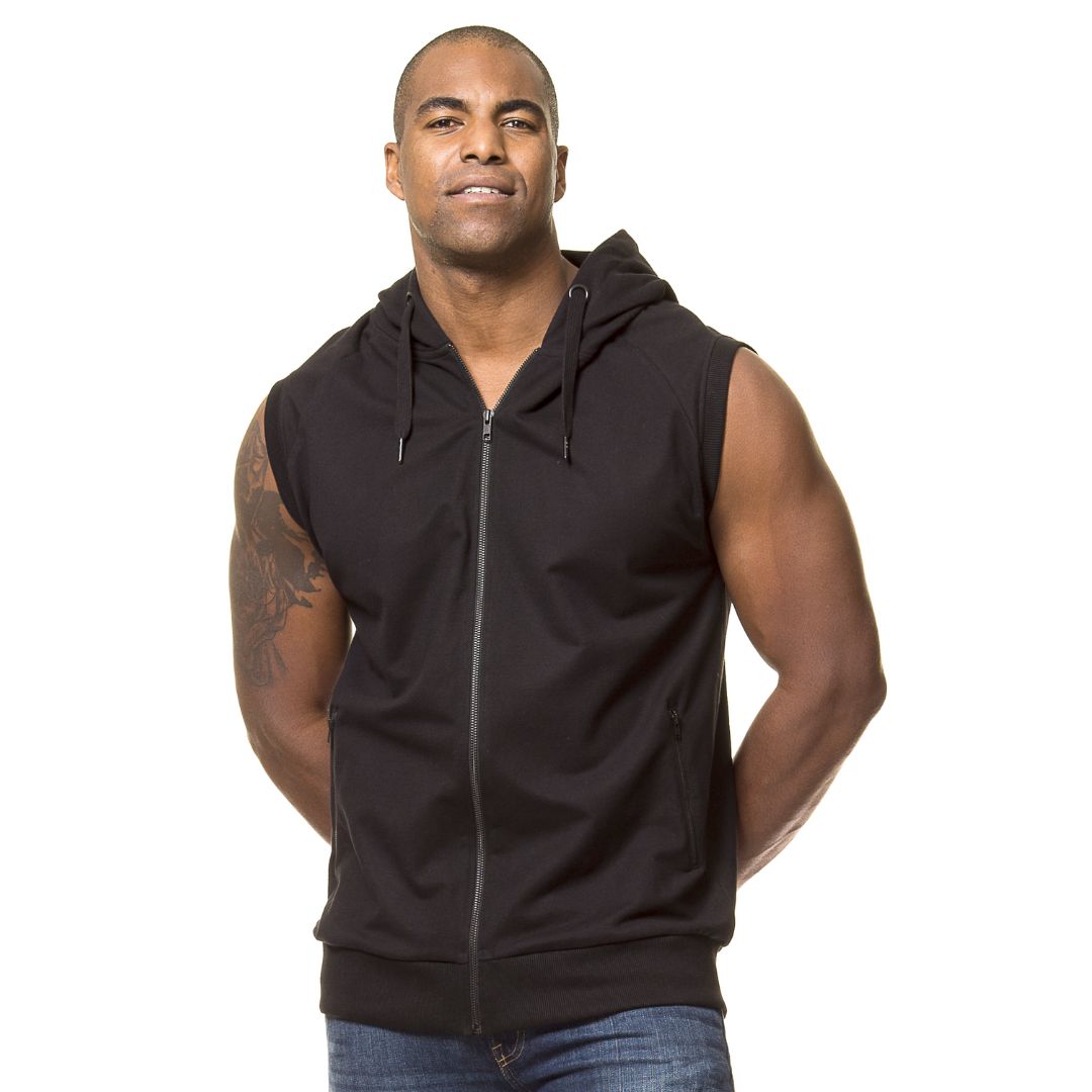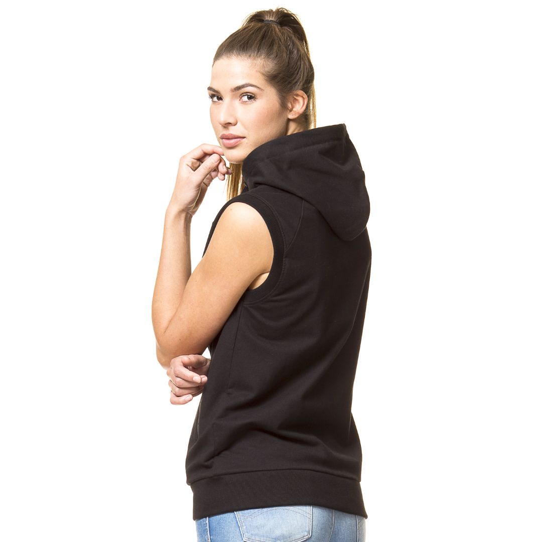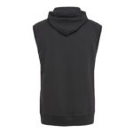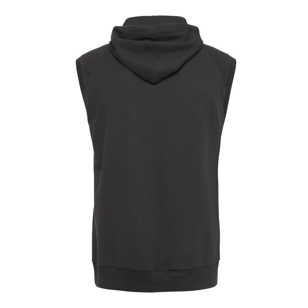 Sweat vest uden ærmer, men med hætte. Hætten har snører og derudover er der lynlåslommer i siderne.