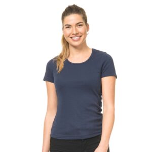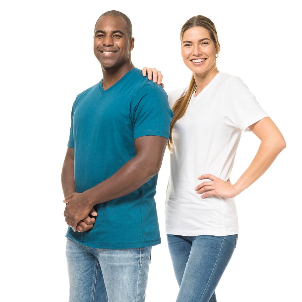 Moderne T-shirt der har v-hals, nakkebånd, dobbeltstikninger og sidesøm.