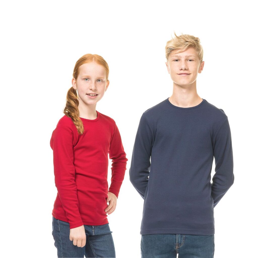 Tætsiddende T-shirt med lange ærmer og rund halsudskæring med smal rib. Dobbeltstikninger og sidesøm.